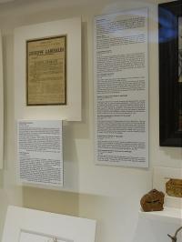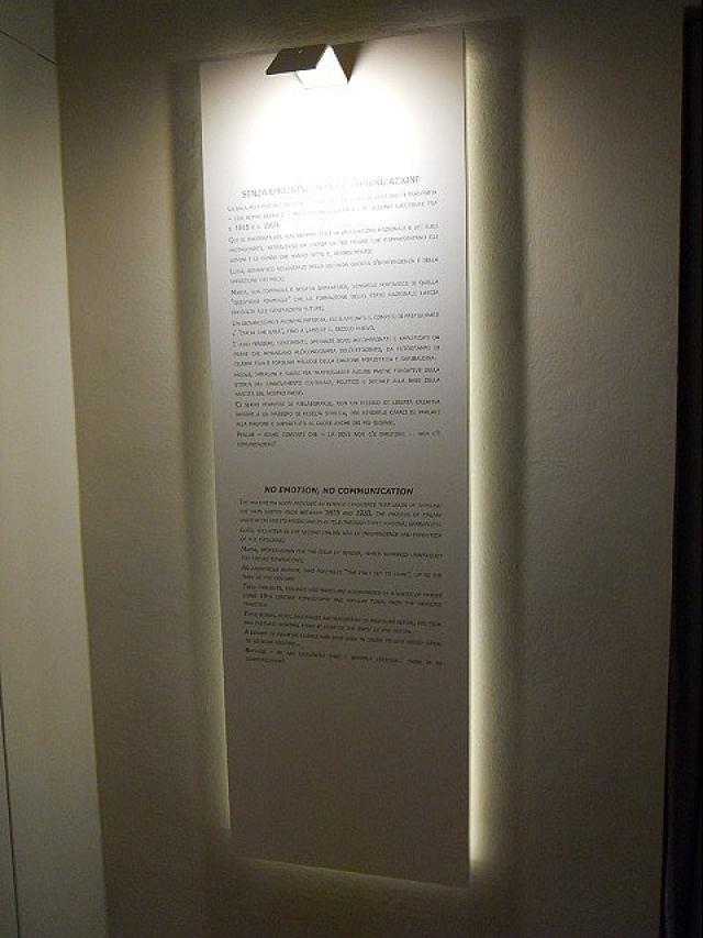 Questa mostra è stata interamente allestita con stampe su pvc adesivo e con intaglio di scritte in prespaziato, applicate in ambedue i casi, su supporto rigido o su parete.